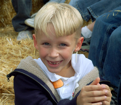 He's the boy who once ran into the room and yelled "I love everything!" And he does. I went with his class on a field trip the other day and he just enjoyed it all so much. The other kids were a little bored with some of the things, unimpressed, but Abe loved it all---including the (not-very-funny) Singing Chicken Show. Here he is motioning me over: "Isn't this FUNNY, Mommy?"